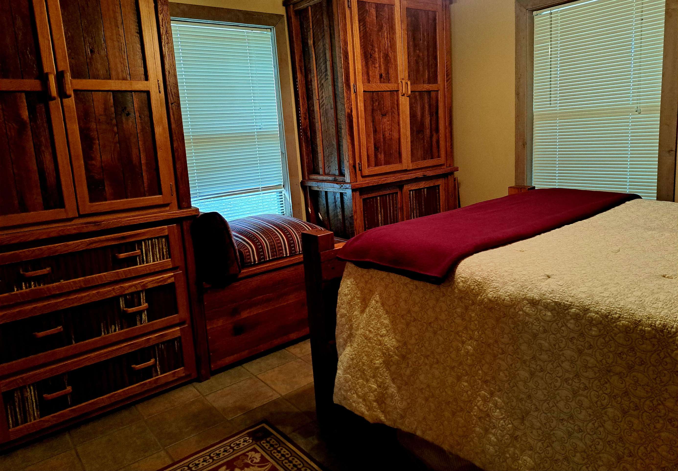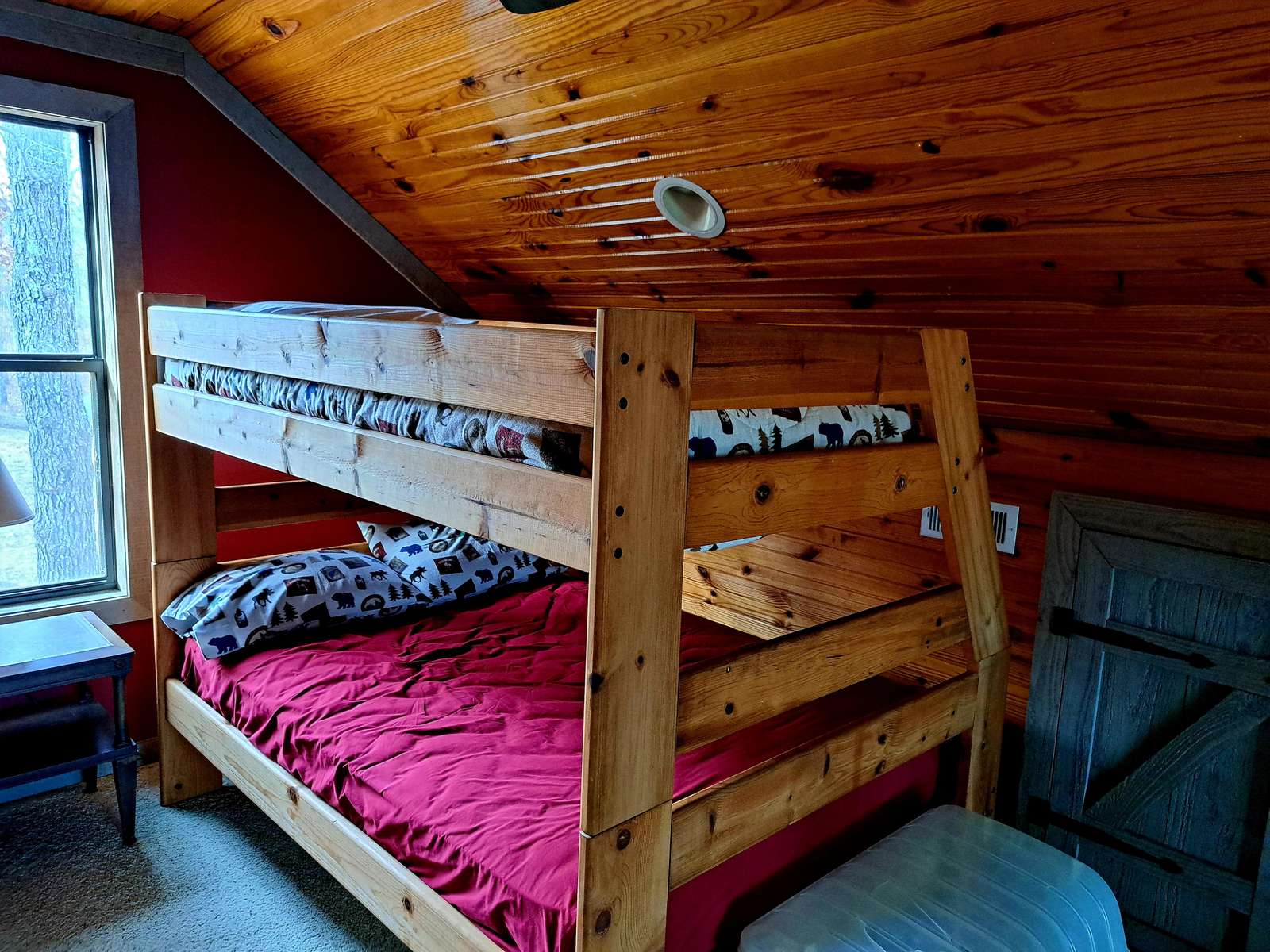 It has one bedroom with a queen size bed and a loft bedroom that has 2 sets of very nice wood bunk beds with twin mattresses over doubles. There is one full bathroom.