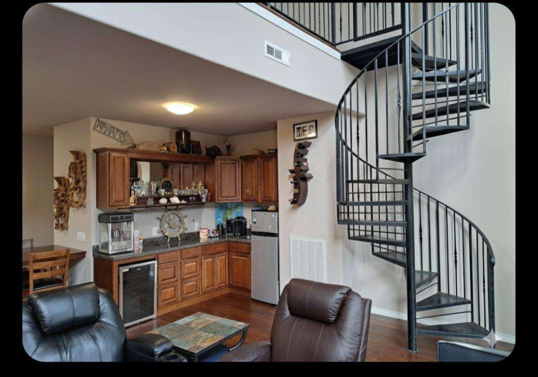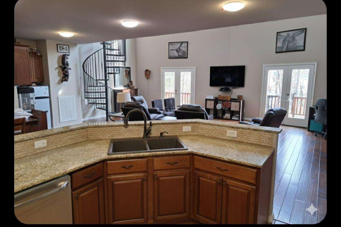 Enjoy the open kitchen/living room area that looks out over the lake.
