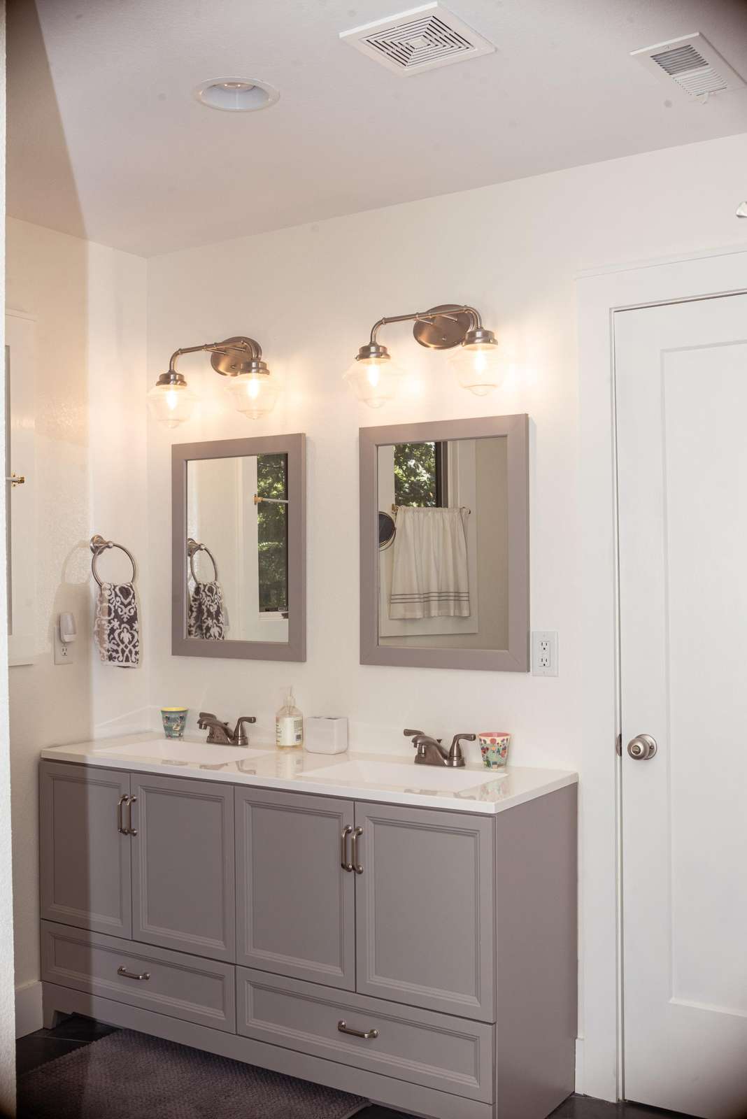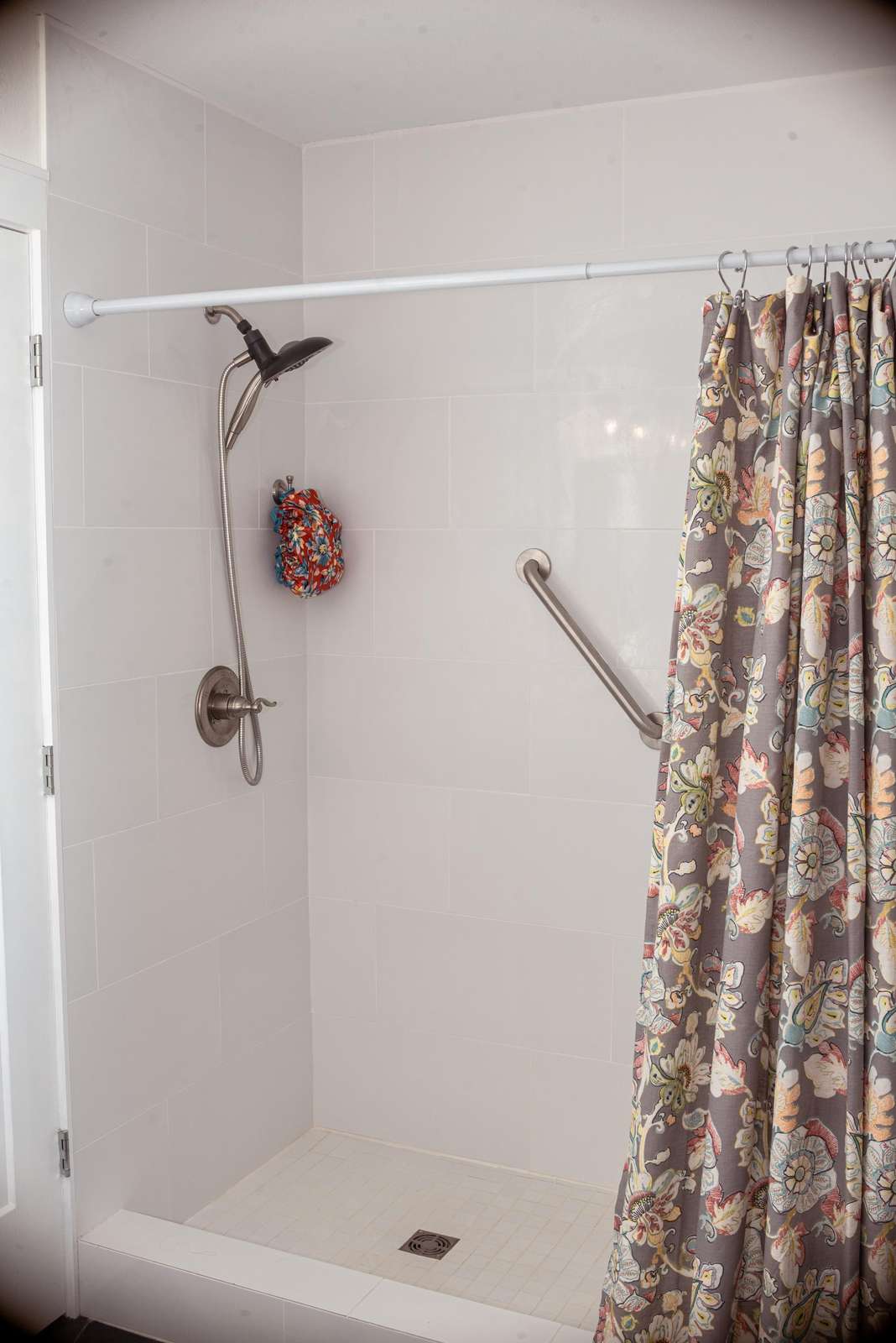 Large modern tiled bathroom has double vanity, separate water closet for privacy, large walk-in tile shower with nice soap, plenty of nice towels, beach towel. First aid supplies, bug spray and sunscreen always on hand. Plenty of storage for your toiletries.