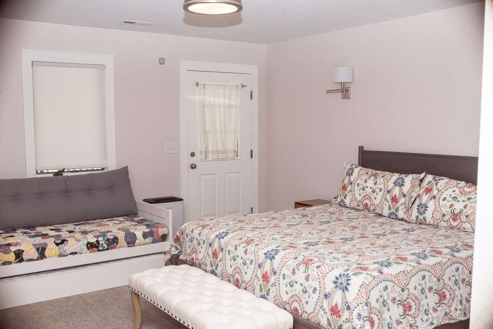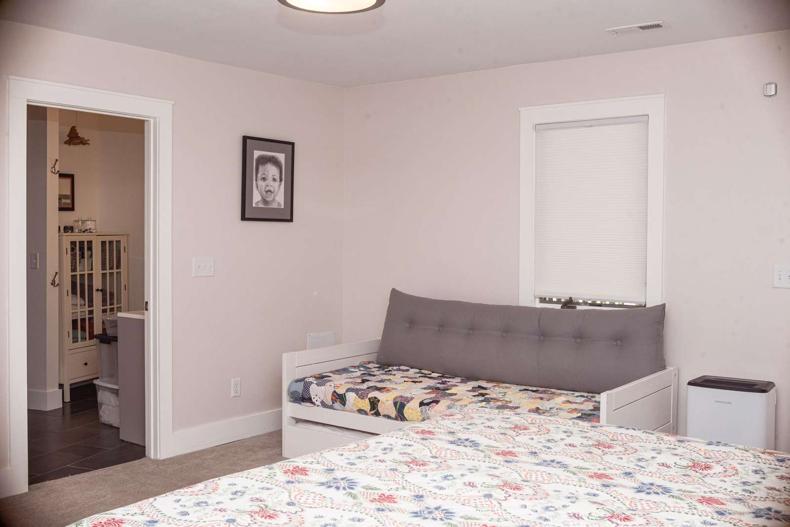 Master bedroom features nice firm California king with memory foam topper, high thread count sheets and plenty of pillow. Twin day bed has pop-up trundle for the kiddos. Big closet with lot of storage as well as bureau and nightstands. Deck access.