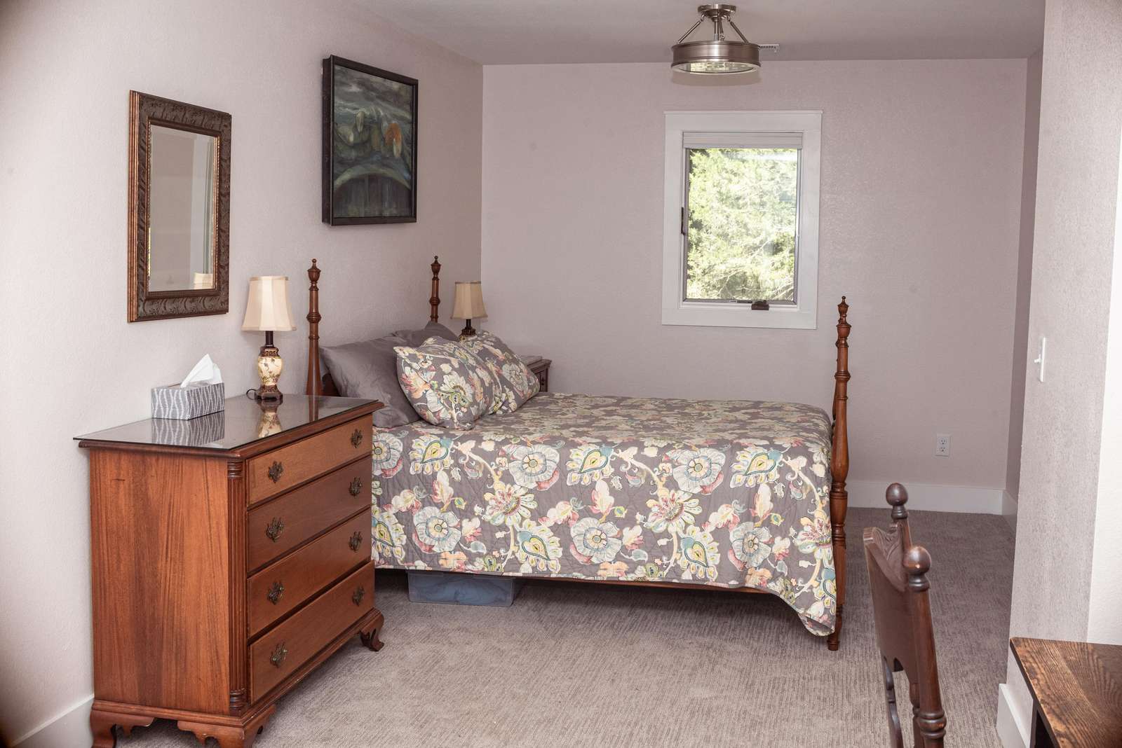 Back bedroom features a 4 poster mahogany full bed with matching bureau and a workspace nook with antique desk/chair and printer.