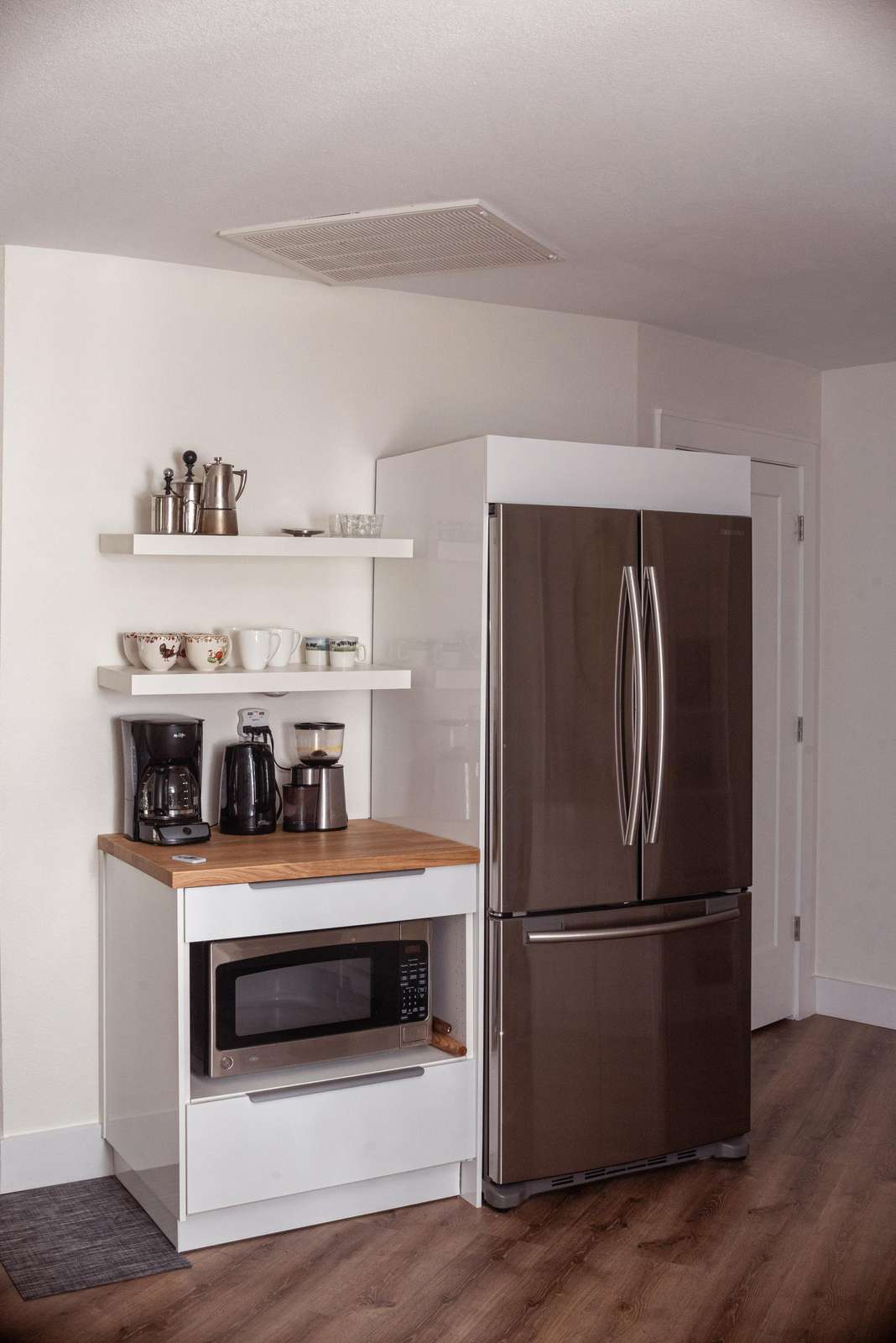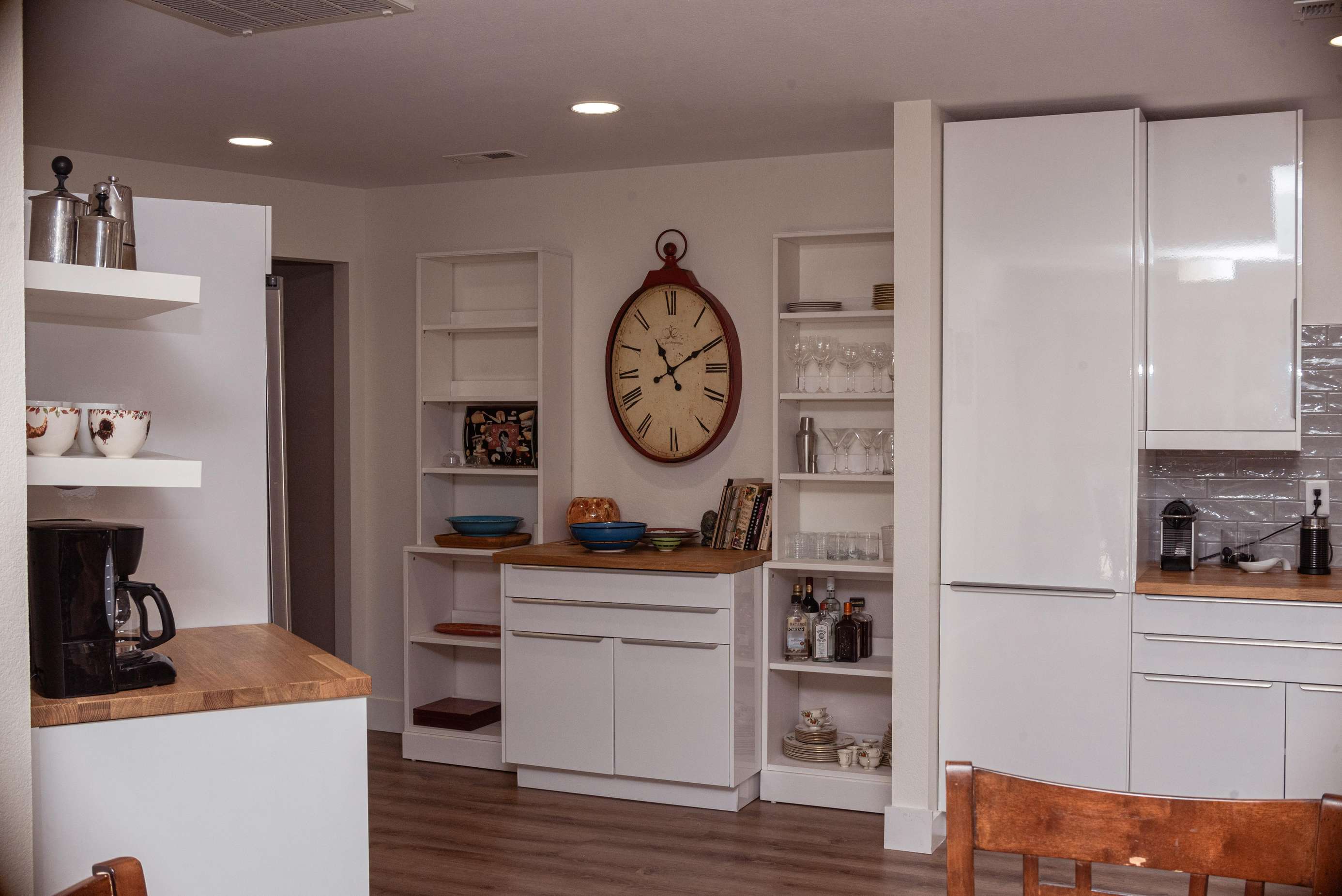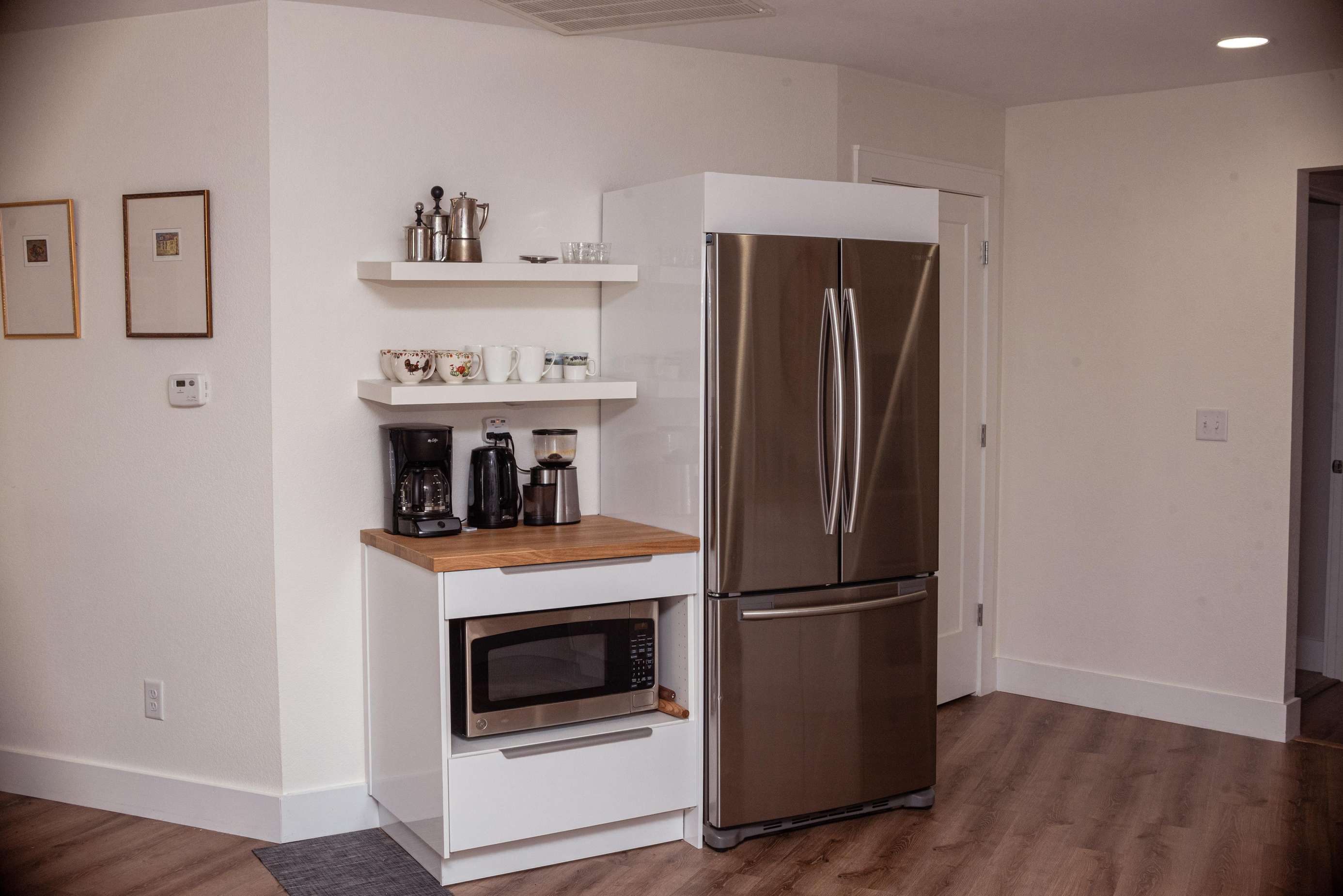 Gleaming gourmet kitchen features wood countertops, glass top range, convection oven, microwave, toaster, blender, frig with icemaker and bottom freezer. Baking pans and equipment galore along with basic supplies, spices, condiments. Pretty much anything you need to cook is here. Full-on barista station with many options for your caffeine needs. Ample china, flatware, serving pieces and barware.