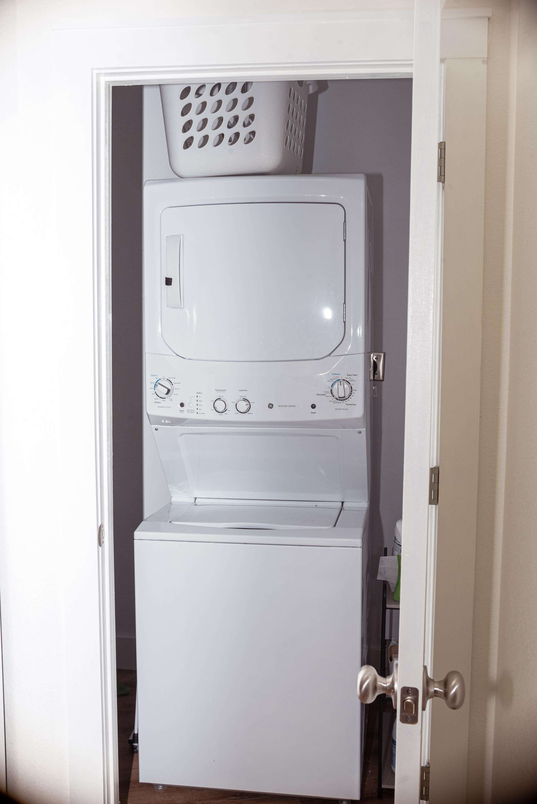 Small laundry utility room has stacking washer/dryer combo that does a big load, drying rack, iron, laundry essentials.