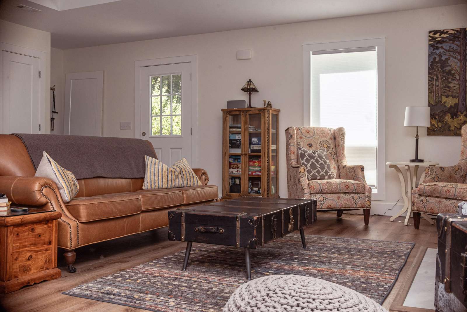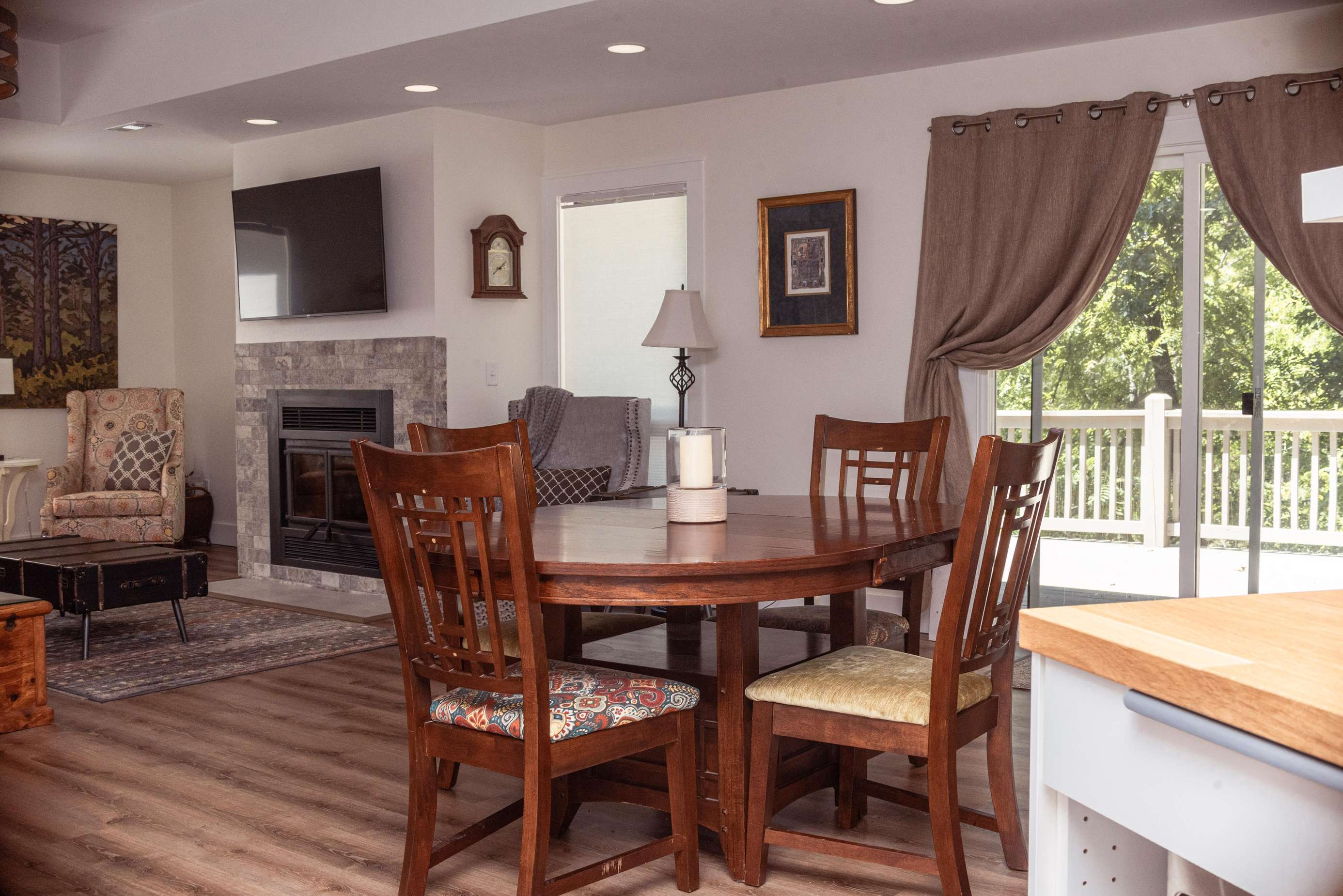 Living area with floor to ceiling casement windows and slider to the deck features leather sofa, comfy arm chairs, dimmable lighting, and a wood-burning fireplace. Plenty of board games and puzzles along with RokuTV with options galore. Sonos speakers and Bluetooth speaker for tunes. Internet/TV via cable and home WiFI signal is excellent. Cell service via WiFi is recommended.